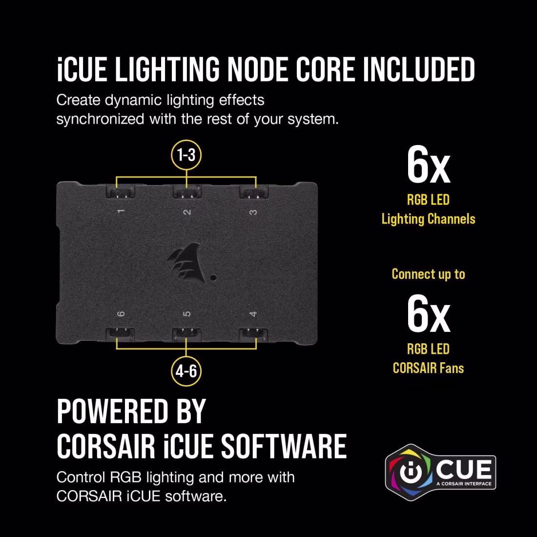 Control RGB lighting via CORSAIR iCUE software with the incredibly compact Lighting Node CORE*, cutting down cable clutter with simple USB 2.0 and SATA connections.